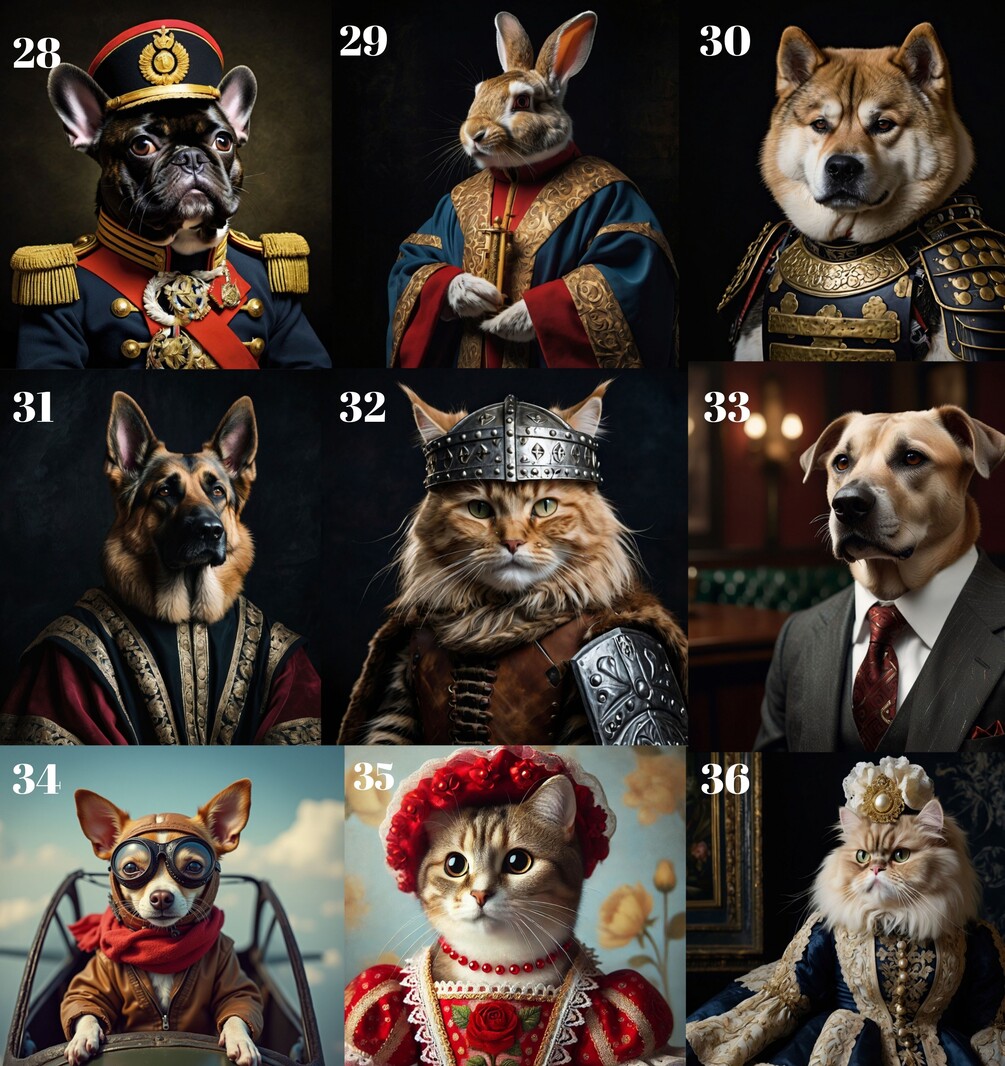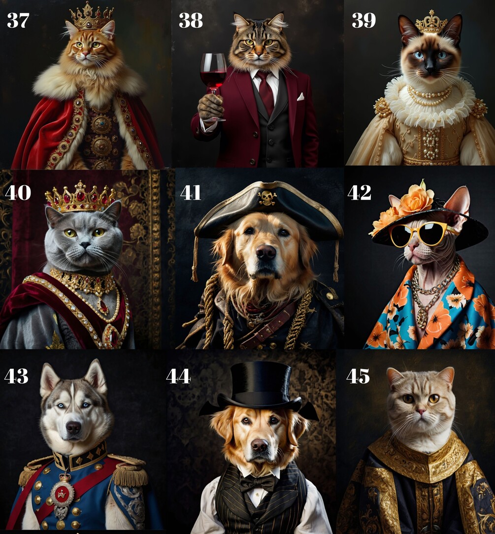 Welcome to CreAIDesign! Our entirely digital and quickly accessible pet portraits combine your pet’s image with royal family portraits. Using a fun photo merging technique called Royal Pet Portraits, you can memorialize your lost cat, dog, or other pets by turning their photos into a unique artistic painting featuring them as a king, princess, or adventurous pirate. Each portrait is custom-made for your order and professionally crafted to be indistinguishable from a real oil painting, turning your pet’s memory into a cherished gift. These portraits can be gifted to your loved ones or family. In our catalog with over 60 different varieties, we also offer many unique designs in various styles beyond Royal Family Portraits. You can choose any example from this catalog when placing your order.